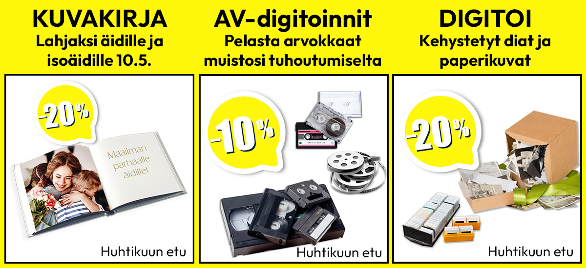 Kuvakirja on oiva äitenpäivälahjaidea. Nyt -20% malli kuin malli - Pelasta arvokkaat videomuistosi ajan hampaalta digitoimalla ne. Voit katsella niitä sen jälkeen vaikka puhelimeltasi tai jakaa niitä ystävillesi - Digitoi samalla myös kaikki dia- ja paperivalokuvasi. Digitoidut kuvat saat mahtumaan vaikka yhdelle muistitikulle jolloin ne kulkevat aina mukanasi ja ovat turvassa.